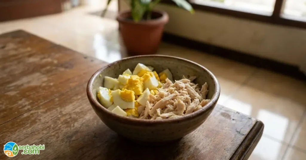 2. Ayam Rebus Tanpa Garam Dada ayam direbus polos, suwir kecil-kecil. Hindari bumbu apapun (bahaya ginjal SG). Harga: Rp5.000/porsi dari 100g dada ayam.